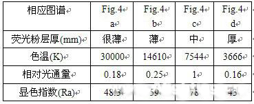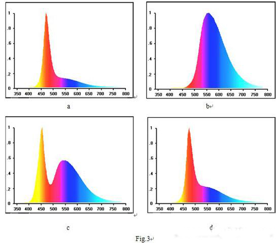 我們曾對此進行了實驗研究,我們利用某公司生產的1W高亮度藍光LED,其光譜的中心輻射波長為470nmFig.3,去除外封裝后分別涂敷不同厚度的輻射的中心波長為560nm的黃光熒光粉涂層,經處理后測量其發射光譜。從二十余種不同厚度的樣品中選擇了四種典型情況,其結果見Fig.4 a,b,c,d及附表。最佳情況下(Fig.4 c)的光通輸出為38lm(初始冷態約50lm),顯色指數為78
