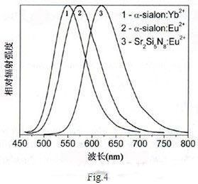年日本材料科學研究所納米陶瓷中心得到的結果是最高的[3],他們采用中心波長為450nmInGaN藍光LED和光子轉換效率高、在450nm藍光范圍 有強吸收峰、溫度系數低的三種熒光粉進行了試驗,這三種熒光粉分別為:α-sialon: Yb2+α-sialon: Eu2+Sr2Si5 N8: Eu2+。這些熒光粉的特點是發光效率的熱衰減較小,在150時仍保持初始值的85%。這三種熒光粉的發射光譜示如Fig.5