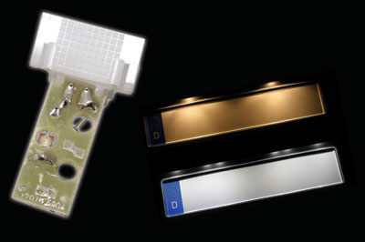 如圖2所示,光線可以從安裝在小尺寸PCB板上的表面貼裝LED器件發出,并使用限流電阻和反極性保護二極管。光線被直接照到簡單或精心設計的導光管上,這是約束光線的極其簡單方法。比較常用的方法是用適當的“透鏡”或投光面體,安裝方法也經常是在轎車內部把它夾進車門嵌板開口的地方、中央控制臺或儀表盤上。