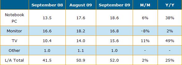 盡管桌上型液晶顯示器面板出貨較上月下滑8%,出貨量僅為1千6百萬片,同時這也是桌上型液晶顯示器用面板出貨自今年2月份以來首次呈現下滑狀態,然而全球大尺寸液晶面板仍較上月增長。9月份三星(Samsung)在可攜式電腦(包括筆記本電腦與上網本)用面板方面出貨總數超過5百萬片,這也是首次單月份可攜式電腦用面板出貨最高紀錄。