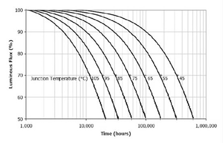由圖中可以得出結(jié)論,要延長其壽命的關(guān)鍵是要降低其結(jié)溫。而降低結(jié)溫的關(guān)鍵就是要有好的散熱器。能夠及時地把LED產(chǎn)生的熱散發(fā)出去。