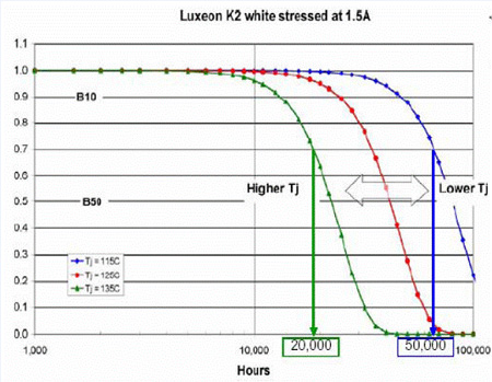 當結(jié)溫從115℃提高到135℃,就會使壽命從50,000小時降低到20,000小時。其他各家公司的光衰曲線應當可以向原廠索取。