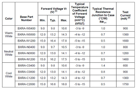 假定對LED以Io恒流供電,在結(jié)溫為T1時,電壓為V1,而當結(jié)溫升高為T2時,整個伏安特性左移,電流Io不變,電壓變?yōu)閂2。這兩個電壓差被溫度去除,就可以得到其溫度系數(shù),以mV/oC表示。對于普通硅二極管,這個溫度系數(shù)大約為-2mV/oC。但是LED大多數(shù)不是用硅材料制成的,所以它的溫度系數(shù)也要另外去測定。幸好各家LED廠家的數(shù)據(jù)表中大多給出了它的溫度系數(shù)。例如對于Cree公司的XLamp7090XR-E大功率LED,其溫度系數(shù)為-4mV/oC。要比普通硅二極管大2倍。至于美國普瑞的陣列LED(BXRA)就給出了更為詳細的數(shù)據(jù)。