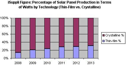 據iSuppli公司調查顯示,薄膜太陽能電池正在迅速攫取晶體技術已有的市場份額,到2013年,其光伏部分的瓦特數會增加一倍多。