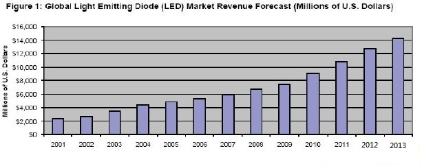 根據預測,高亮度和高通量LED 的固態照明市場在2013 年前的增長速度將高于整體LED 市場。到2013 年,標準亮度LED 傳統市場創造的營業收入將下降2.5%左右,而高亮度LED 市場將增長6.7%至54 億美元左右。高通量LED 市場將增長近53%至大約78 億美元。