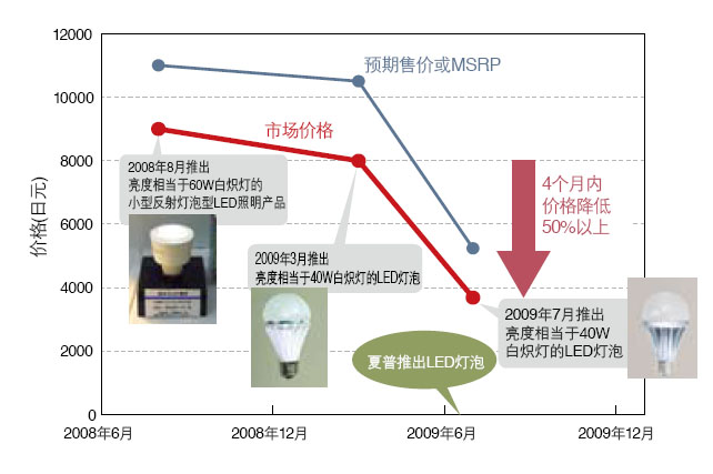 2008年,夏普公司以低價(jià)策略進(jìn)軍LED照明市場。2009年6月,該公司發(fā)布了一款全新的LED燈泡,其市場價(jià)格約4000日元,僅為同類競爭產(chǎn)品的一半,推出后立即在市場上掀起了一股強(qiáng)勁的沖擊波。夏普公司的這款低價(jià)產(chǎn)品迫使東芝照明技術(shù)于2009年7月推出亮度相當(dāng)于60W白熾燈的LED燈泡,其廠商建議零售價(jià)約為5000日元,市場價(jià)格約為4000日元。與4個(gè)月前東芝推出的同類產(chǎn)品相比,價(jià)格大幅下降了50%(見圖1和表1)。