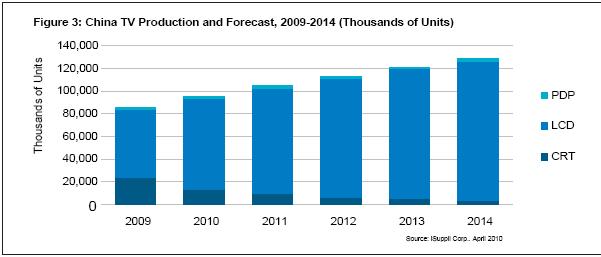 據iSuppli公司,中國電視市場已經是全球舞臺上的主角,預計2010年再度有強勁表現,整體電視產量上升,同時對于液晶電視的需求大增。