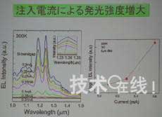 另外,該元件還呈現(xiàn)出如果增加注入電流、發(fā)光強(qiáng)度就會(huì)大幅提高的傾向,因此丸泉表示,“如果通過(guò)光子結(jié)晶形成共振器構(gòu)造,就應(yīng)該會(huì)產(chǎn)生激光振蕩。今后計(jì)劃將發(fā)光波長(zhǎng)變更為可用于通信的1.5μm頻帶。將在2~3年后開(kāi)發(fā)出作為光開(kāi)關(guān)工作的元件,并實(shí)現(xiàn)實(shí)用化”。