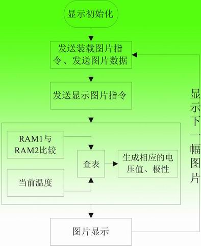 APOLLO驅(qū)動(dòng)電子紙顯示的操作流程如圖4所示。電子紙的顯示依據(jù)是要顯示的圖片與當(dāng)前顯示圖片相比較,得出其差值,再根據(jù)當(dāng)前溫度查詢對應(yīng)的數(shù)據(jù)表格,依相應(yīng)數(shù)據(jù)輸出驅(qū)動(dòng)。因此在上電后需對電子紙進(jìn)行顯示初始化,這樣后續(xù)的圖片顯示就有較好的基準(zhǔn)值。顯示初始化后RAM1數(shù)據(jù)全置為1,第一幅圖片數(shù)據(jù)存于RAM2,顯示第一幅圖片時(shí)將RAM2與RAM1進(jìn)行比對,查表顯示輸出;第二幅圖片數(shù)據(jù)存于RAM1,顯示第二幅圖片時(shí)將RAM1與RAM2(存儲(chǔ)當(dāng)前圖片)進(jìn)行比對,查表顯示輸出,RAM1即存儲(chǔ)當(dāng)前圖片;下一幅要顯示的圖片存儲(chǔ)于RAM2中,依次類推,循環(huán)執(zhí)行即可輸出要顯示的畫面。