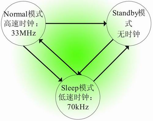 電子紙顯示的顯著特點(diǎn)之一是其省電模式,當(dāng)其顯示一幅畫面后,由于電子紙的特殊技術(shù)因素,此幅畫面在無供電或不刷新的情況下可長時(shí)間保持。APOLLO芯片驅(qū)動(dòng)部分也同樣具有兩種省電模式:Sleep和Standby,能夠很好的實(shí)現(xiàn)低功耗的工作方式。Sleep模式使用低時(shí)鐘(70kHz),能夠接收主CPU的指令;Standby模式不使用時(shí)鐘,利用主CPU的喚醒信號使APOLLO恢復(fù)有效。這兩種模式與Normal模式的轉(zhuǎn)換如圖5所示。