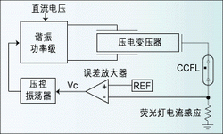 圖4給出了一個基于PZT的背景光轉換器的簡化功能圖。PZT由一個幅度正比于輸入電壓的諧振功率級驅動,它提供驅動熒光燈所需要的電壓增益。圍繞著誤差放大器形成了一個控制環,誤差放大器把平均熒光燈電流同參考信號(REF)相比較,以便于對熒光燈的光強度進行調節??刂齐妷篤c驅動用來確定諧振功率級的運行頻率的壓控振蕩器(VCO)。