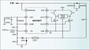 與磁性變壓器電路不同,基于PZT的電路使用頻率而不是占空比來控制熒光燈電流。UCC3977包含一個在COMP和OSC引腳之間形成的可編程的VCO,該VCO用來設定該系統的工作頻率范圍(它必須包含PZT的激發和工作頻率),熒光燈電流可以在FB引腳進行測量并由PZT的增益/頻率的特性進行控制(參見圖3)。為保證控制回路一直工作在諧振峰的右側,PZT的增益必須在最小輸入電壓下提供足夠高的熒光燈電壓。