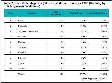 與此同時(shí),2009年市場份額數(shù)據(jù)顯示,隨著Pace公司完成對飛利浦STB業(yè)務(wù)的收購,正在成為新的市場份額王者。