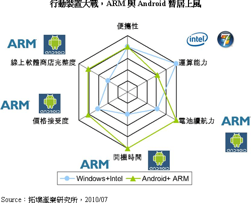 今年在智慧型手機(jī)作業(yè)系統(tǒng)及處理器都沒(méi)有發(fā)表新版本的情形下,2010年第二季智慧型手機(jī)較去年同期成長(zhǎng)了43%,采用ARM處理器與Apple作業(yè)系統(tǒng)的iPad以每月出貨100萬(wàn)臺(tái)的速度快速成長(zhǎng)。而搭載Intel Capella新平臺(tái)及Windows 7的NB出貨量雖然也表現(xiàn)不惡,但第二季的年成長(zhǎng)率只有32%,兩者潛力高下立判。