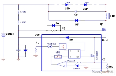 圖5是源極驅動控制電原理路,從中可見BP2808內部的低壓開關MOS管(700mA)漏極連接到外部功率開關MOS管Q1的源極,而其源極連接到采樣電阻RCS的一端以及第一比較器的輸入端,其柵極連接到RS觸發器的輸出端。外部功率開關MOS管Q1的漏極輸出電流經儲能電感直接驅動LED光源。芯片內的Do是饋流二極管,在BP2808啟動工作后,從OUT到VCC的饋流經Do整流向BP2808提供工作電源。
