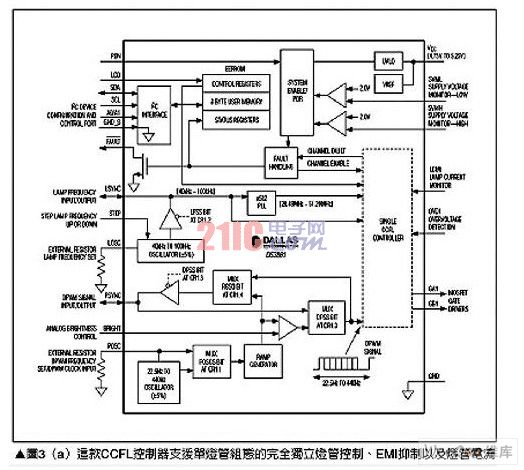 傳統(tǒng)上LCD面板使用CCFL燈管作為背光源,主要是這項(xiàng)技術(shù)擁有良好效率、低溫以及高照明能力等優(yōu)勢(shì),雖然CCFL控制器在非汽車類應(yīng)用中,例如液晶電視或液晶顯示器上相當(dāng)成功,但汽車的工作環(huán)境卻對(duì)這項(xiàng)技術(shù)帶來特殊的挑戰(zhàn)與要求,為了讓元件數(shù)減少,CCFL控制器必須包含包括如EMI抑制、燈管電流過度驅(qū)動(dòng)(overdrive)能力,以及將接腳數(shù)降到最低的串行控制接口、各信道燈管失效監(jiān)測(cè)、燈管頻率與DPWM控制用精確內(nèi)建振蕩電路以及其它功能等,這類解決方案有美信(Maxim)公司的DS3881,請(qǐng)參考圖3(a),其只需少許的外加電路,就能夠組合出完整的CCFL電源控制子系統(tǒng),請(qǐng)參考圖3(b)。DS3881主要針對(duì)汽車應(yīng)用環(huán)境進(jìn)行最佳化設(shè)計(jì),由于所采用的基礎(chǔ)電路組態(tài),因此外部晶體管、變壓器以及燈管本身就形成了EMI的噪聲來源,DS3881通過使用展頻與頻率偏移技術(shù)來降低EMI發(fā)射,并將任何未移除噪聲移到非關(guān)鍵頻帶來解決這個(gè)問題。