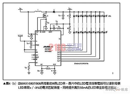 對(duì)于較小型的顯示面板,就可以使用LED矩陣來取代CCFL背光,不過使用多個(gè)LED串也會(huì)帶來相對(duì)的設(shè)計(jì)挑戰(zhàn),其中最明顯的是如何能夠在整個(gè)區(qū)域提供一致的照明與色彩輸出。推動(dòng)LED背光矩陣的一個(gè)方式是采用內(nèi)含8個(gè)LED驅(qū)動(dòng)通道,分別可以提供55mA電流輸出的MAX16807與MAX16808,請(qǐng)參考圖4(a),圖4(b)則顯示了采用MAX16807的典型電路如何簡(jiǎn)化系統(tǒng),只需少數(shù)幾個(gè)元件就能夠完成背光驅(qū)動(dòng)子系統(tǒng)的設(shè)計(jì)。