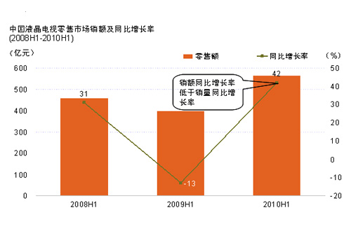 根據捷孚凱(GfK 中國)全國液晶電視零售推算數據,2010年上半年液晶電視市場整體規模為1517萬臺,同比2009年上半年規模增長55.2%,而銷售額同比增長42%。上半年度整體彩電市場規模為1863萬臺,液晶電視在整個彩電市場中的占比已經達到82%。