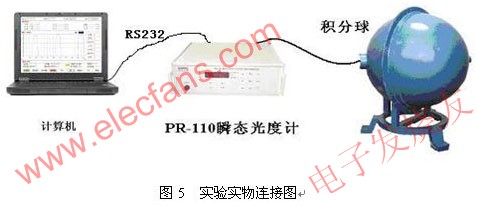 為了精確測量光通量,把光源放在積分球中。經過V(λ)校準的光電探測器接受光信號,其輸出的電信號經過放大轉換電路,將光電探測器輸出的光電流信號轉換成較大的電壓信號,利用AD轉換器進行采樣。由于單片機讀取和存儲數據速度較慢,故而采用了雙口RAM和地址發生電路,使得光度計能夠在采用時自動對數據進行存儲。單片機則在所有采樣過程執行完畢后,再從雙口RAM內讀取數據,并發送給微機顯示處理。系統結構圖和實物連接圖如下。