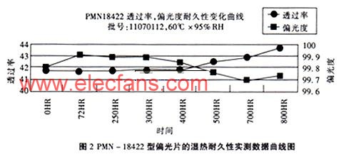 耐濕熱技術指標是指偏光片在恒溫恒濕條件下的耐濕熱工作性能,它也通常分為三個技術等級,既通用型:濕熱工作條件為40℃×90%RH×500HR;中耐久型:濕熱工作條件為60℃×90%RH×500HR;高耐久型:濕熱工作條件為:70℃×95%RH×500HR以上。由于構成偏光膜的基本材料PVA膜和碘及碘化物都是極易水解的材料,同時也由于偏光片所使用的壓敏膠在高溫高濕條件下也容易劣化,因此,在偏光片的耐久性技術指標中最重要的就是耐高溫和耐濕熱指標,如果耐高溫和耐濕熱指標通過,其它耐久性型指標通常都不會發生問題。“福地”牌通用型PLN產品和中耐久PMN產品都能夠很好地滿足各自相應技術等級所規定的耐久性技術指標的要求(見圖2)。