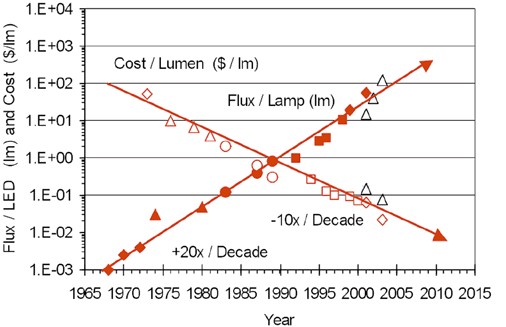 上述的講法聽來有些讓人疑惑,今日不是一直強調LED的亮度突破嗎?2003年LumiledsLighting公司RolandHaitz先生依據(jù)過去的觀察所理出的一個經(jīng)驗性技術推論定律,從1965年第一個商業(yè)化的LED開始算,在這30多年的發(fā)展中,LED約每18個月;24個月可提升一倍的亮度,而在往后的10年內,預計亮度可以再提升20倍,而成本將降至現(xiàn)有的1/10,此也是近年來開始盛行的Haitz定律,且被認為是LED界的Moore(摩爾)定律。