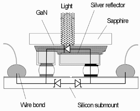 Lumileds公司Luxeon系列LED的裸晶實行覆晶鑲嵌法,因此其藍寶石基板變成在上端,同時還加入一層銀質作為光反射層,進而增加光取出量,此外也在SiliconSubmount內制出兩個基納二極管(ZenerDiode),使LED獲得穩(wěn)壓效果,使運作表現(xiàn)更穩(wěn)定。