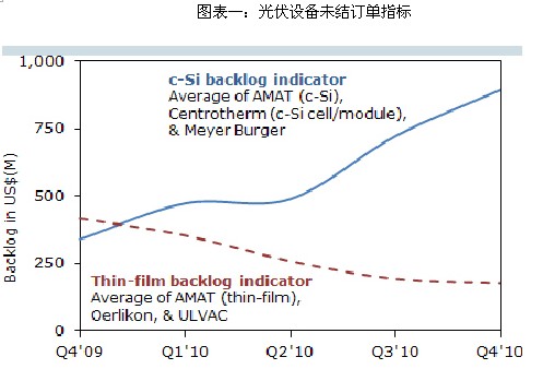 隨著2011年所公布的超越60%年度增長率的產能的擴張,首選設備供應商的訂單使得未結訂單總量創下新記錄,超過了2008年由高價格交鑰匙薄膜生產線業務推動的水平。2010年第四季度末,有20家設備供應商的訂單積累已經超過了1億美金,這些訂單主要的出貨時間集中在2011年上半年。目前的未結訂單總量與2009年第四季度相比有26%的增長,導致2010年的訂單出貨比原高于上一年水平(1.24),其中2010年第二季度的更是創下了1.7的八季高點。