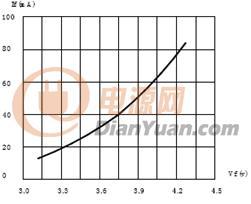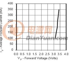 假如用干電池或蓄電池供電,那么因為LED伏安特性的非線性,很小的電壓變化就會引起很大的電流變化,上圖中電源電壓在3.3V時正向電流為20mA的LED,如果用3節干電池供電,新的電池電壓超過1.5V,3節就是4.5V,LED的電流就會超過100mA,很快就會燒壞。對于1W的大功率LED也是如此,圖2是某公司1W的LED伏安特性,而一個12V蓄電池的電壓,在充滿電到快放完電的電壓可以從14.5V降到10.5V。相差將近20%。從伏安特性上可以看出,電源電壓的10%的變化(3.4V-3.1V),就會引起正向電流的3.5倍的變化(從350mA變到100mA)。