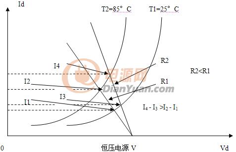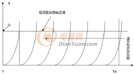 溫升以后,N個伏安特性都左移,就使電流的增加也加大了N倍。如果采用恒流電源供電,那么溫升以后,仍然能夠保持電流恒定為Io。