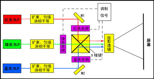 以投影方式為激光顯示解決方案的工作原理如圖1.1所示:紅、綠、藍三色激光分別經過擴束、勻場、消相干后入射到相對應的光閥上,光閥上加有圖像調制信號,經調制后的三色激光由X棱鏡合色后入射到投影物鏡,最后經投影物鏡投射到屏幕,得到激光顯示圖像。