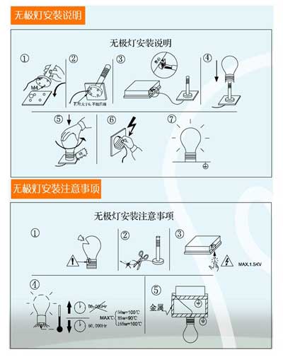 2)工作時環(huán)境溫度不得超過50℃; 3)必須與無極熒光燈燈泡正確連接后,方可接通電源;
