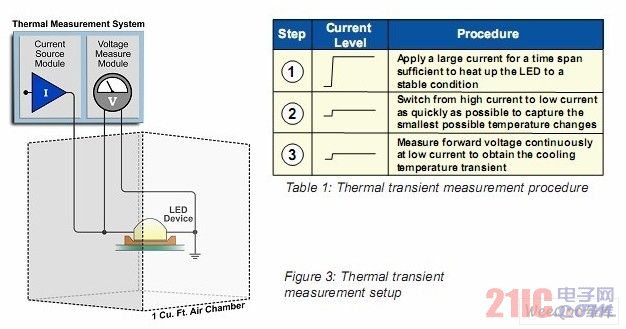 圖3描繪了此類測量裝置的簡圖(不成比例)。測量的第一步是確定前向電壓在一個非常小的電流下的溫度敏感性,這個小電流可以是傳感器或測量電流。之后,LED被施加一個大電流,從而使其變熱。接著停止施加大電流,并且很小的傳感器電流再次出現,同時用一個高采樣率完成前向電壓的測量,直至LED結溫完全趨于穩定。由于LED快速的熱響應,所以測量的硬件設備必須能夠捕捉LED電流停止施加后幾微秒內的溫度(電壓)改變。如圖3所示,被測量的LED處于一個封閉空間內,這個封閉空間是JEDEC標準的自然對流腔,它提供了一個沒有氣流流通的環境。T3STer也可以提供類似的裝置。表格1歸納了測試步驟。