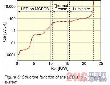 在圖5中,最初的曲線非常陡峭,同時熱容被加熱。這個曲線進行了注解,描述了LED/MCPCB,封固劑(導熱硅脂)和照明設備三個階段。但在第一個階段內,曲線描述了更小的一些階段,譬如Dieattach,散熱板,甚至是緊固銅散熱板和MCPCB的膠水。注意這個圖形證實了早期的一個論點,那就是LED自身的熱阻占整個系統結點至環境熱阻的50%。