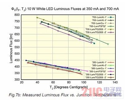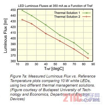 在圖7a中顯示了兩個同一廠商的兩個白色LED光通量和參考溫度的關系,這兩個LED具有不同的散熱方式。散熱方式1使用了一塊金屬的PCB板,而散熱方式2使用了傳統的FR4板。此外,兩個LED樣品的PCB板和散熱器之間使用了不同的導熱界面材料。