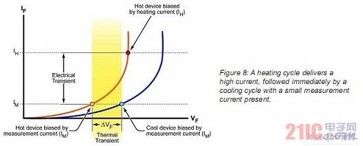 注意,當PN結前向電流突然被停止(在測試過程中),不可避免的發生電瞬態現象。這個瞬態現象會持續很短的一段時間,在這段時間內前向電壓的改變無法描述LED芯片的溫度的改變。因此,在進行測量時必須給電瞬態現象消失留有一個時間上的延遲。