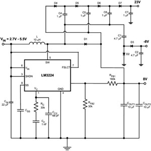 如今各種微型電壓升降壓芯片技術(shù)也日顯成熟,產(chǎn)品也在不斷增加,符合PMP/MP4、DSC、DV的TFT-LCD需要的,能同時(shí)多路輸出它們需要的不同電壓的集成電源管理芯片組(SOC)也在迅速推出之中。TFT-LCD顯示器系統(tǒng)需要多檔電源電壓,如PMP/MP4常用的三星3.5_和4_的TFT-LCD,它們的結(jié)構(gòu)如圖3所示,它們由TFT玻璃(TFTglass)、顏色濾波器(Colorfilter)、顯示區(qū)(Displayarea)、背光板和背光源(Backlight)四部分疊加組成。圖4是三星3.5_的TFT-LCD電路圖。它們的主要技術(shù)參數(shù)是:VIN=2.1-4.0V,VSW=15V/1.4A、VS=15V;用6個(gè)LED串聯(lián)做背光源,每個(gè)LED的VF=3.4V、IF=20mA,因此需要一個(gè)24V/50mA的電壓來(lái)驅(qū)動(dòng)。常常選用帶電感的DC/DC來(lái)升壓,再加上倍壓電路,輸出多檔電源電壓滿足TFT-LCD的需要,如圖5所示。目前MP3、PMP/MP4、DSC、DV等的小尺寸TFT-LCD屏的低成本背光驅(qū)動(dòng)方案常常是采用這種方法來(lái)設(shè)計(jì)實(shí)用電路的。