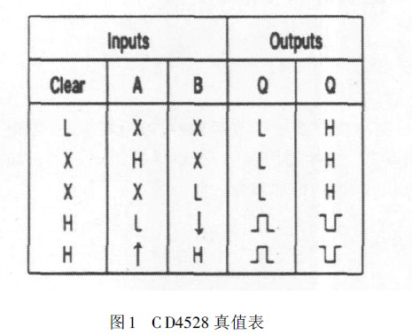 CD4528含兩個單穩(wěn)態(tài)觸發(fā)器,其真值表如圖1。芯片3腳與13腳分別為其內(nèi)部兩個獨立單穩(wěn)態(tài)電路的Clear 端,5腳和11腳為單穩(wěn)態(tài)的B輸入端,4腳與12腳為單穩(wěn)態(tài)的A輸入端。B端接高電平,只有當Clear端為高電平時,A端輸入的上升沿觸發(fā)才會有效。