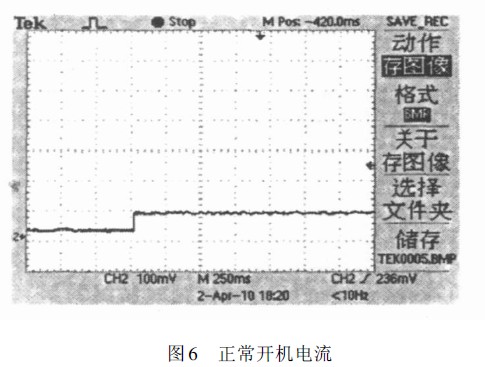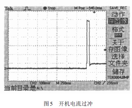 開機時,由于電源濾波電容大,以及各延遲環(huán)節(jié)使得電流采樣反饋值與給定值在調(diào)節(jié)器輸入端不同,這會使得負載電流上升過沖,實測過沖波形如圖5所示。 為了解決這一問題,可以將調(diào)節(jié)器給定端RC 的值適當加大,調(diào)節(jié)以后的開機電流沒有發(fā)生過沖,波形如圖6.