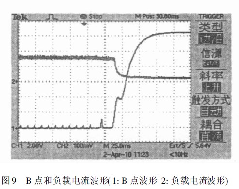 光耦U1、U 2 隨被測電源的正負半周交替導通,當A 點交流電壓大于光耦中發(fā)光二極管的導通電壓Von時,光耦開啟,C3通過光耦中三極管放電,使B 點的電壓達不到場效應管的開啟電壓; 當交流電壓小于Von時,光耦不導通,C3充電,B點的電壓增加,此時應使C3的電壓上升到場效應管閾值的時間大于光耦關(guān)閉的時間,以保證Q2不導通。 在t1時刻交流電源斷開,光耦輸出呈高阻態(tài),C2中存儲的電荷經(jīng)R1向C3充電,C3上的電壓迅速增加,當B點電壓大于場效應管的開啟電壓時,場效應管Q2導通,導通后可迅速將Vs 拉低,圖8中Vs是調(diào)節(jié)器的給定輸入端電壓。 關(guān)機瞬間負載電流和圖8中B點的波形如圖9。改變R1和R4的參數(shù),可以改變給C3充電的時間。 R4選用較大阻值的,可以提高C3上的電壓,同時延長C3的放電時間。 C2的大小可以決定交流電源斷電后維持該電路工作的時間。 綜上所述,設(shè)置合理的參數(shù),便可保證在主電路電源沒有完全關(guān)閉的情況下,Q2一直導通,即誤差放大器的給定輸入端一直為零,避免了電流過沖。