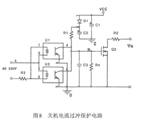 圖8 為關(guān)機電流過沖保護電路,該電路能在3ms內(nèi)迅速檢測出交流電源是否關(guān)閉,并且在電源關(guān)閉后強行將調(diào)節(jié)器給定輸入端的電壓拉低,防止電流過沖,具體動作過程如下。