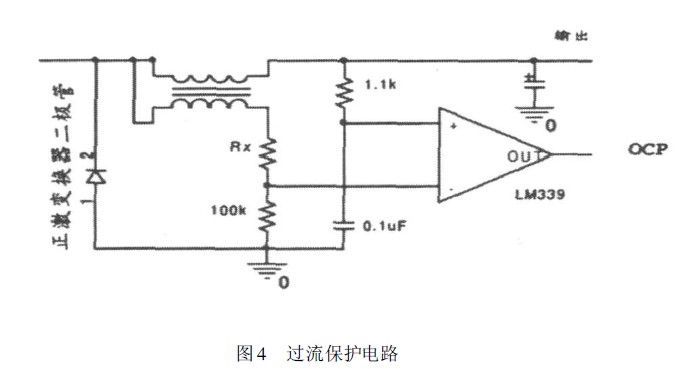 這里采用如圖4的方法,在正激變換器扼流圈放置相同匝數(shù)的線徑較細的線圈。 這兩個繞組是磁平衡的,它們之間本應沒有電壓差。 但是主繞組有直流電阻,大電流時產(chǎn)生了微小的電壓差,該電壓差由負載電流決定。這個微小的電壓差被運放檢測,并且通過調(diào)節(jié)Rx可以設(shè)置電流限制。該電路的缺點是電流限制不是很精細的,這是因為銅電阻在溫度每上升10℃時增加4%。但是這個電路依然可以滿足我們的設(shè)計要求。