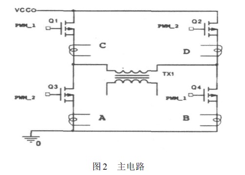 PWM1與PWM2為PWM芯片輸出的兩路互補脈沖信號,主電路(見圖2)中Q1、Q4的驅(qū)動與圖3中PWM1同步,Q2、Q3的驅(qū)動與PWM2同步。 在A、B、C和D4點進行電流上升率采樣然后轉(zhuǎn)變?yōu)殡妷盒盘枺⒎謩e給圖3中的直通信號1與直通信號2。
