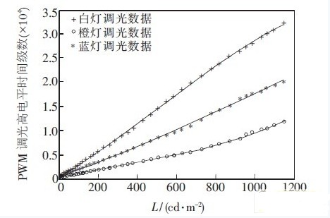 圖3為SS-230平板顯示綜合分析系統(tǒng)的照片。實(shí)驗(yàn)時(shí),調(diào)白光從低亮度到高亮度,橙燈和藍(lán)燈也按比例逐漸增加,保證色溫在(6 500±30)K,色坐標(biāo)u′=0。198,v′=0。468。記錄從低亮度到高亮度調(diào)光過程中,白燈、橙燈和藍(lán)燈的調(diào)光PWM波形高電平持續(xù)時(shí)間的數(shù)據(jù),共記錄40組數(shù)據(jù)。