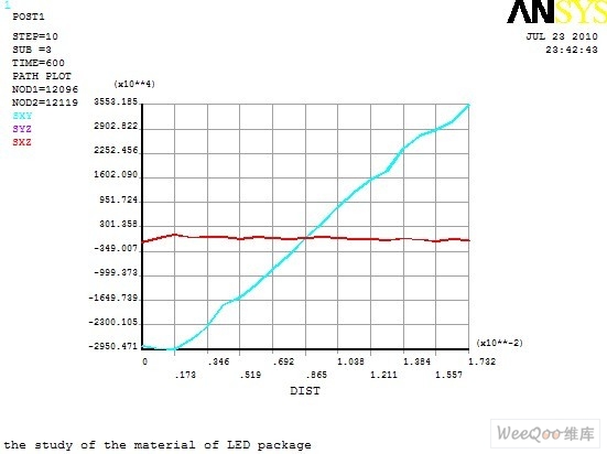 圖10 顯示了路徑上剪應力的變化情況,SYZ 與SXZ 幾乎重合,且剪應力很小,變化平緩;SXY 變化非常劇烈,說明在Y 方向上,即基板與熱沉之間有較大的剪應力,且由中間向兩端增大,表明剪應力主要集中在邊角區域。這是由于基板與熱沉為兩種不同的材料,材料之間的熱膨脹系數及彈性模量不同而產生較大剪應力。