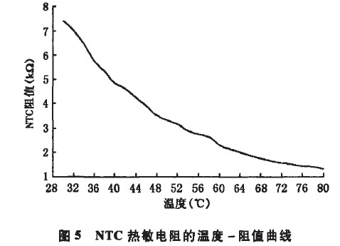 控制電路阻值與輸出總電流的關系列于表1,其中R為控制電路的等效電阻。經過在恒溫箱中測試,每2℃記錄1組數據得到如圖5所示的NTC熱敏電阻的溫度一阻值曲線。該方案中,驅動電源通過接收到反饋的溫度信息來控制輸出電流,根據圖5中NTC的溫度與阻值的關系,只要找到輸出電流隨總阻值的變化關系(如圖6所示),再進行適當的電阻匹配,便可找到溫度與驅動器輸出電流的關系。