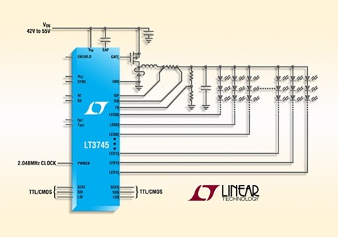 凌力爾特公司 (Linear Technology Corporation) 推出一個集成了55V 降壓型控制器的16通道LED驅動器LT3745。該LED 驅動器為每通道加電至 75mA LED 電流,可驅動高達36V的串聯LED,從而使該器件非常適用于諸如大型LED廣告牌等應用。每個通道都有單獨的 6 位點校正電流調節和12位灰度等級PWM調光。加上0.5μs 的最短LED接通時間,LT3745提供了非常寬的動態對比度。點校正及灰度等級均可通過 TTL/CMOS 邏輯電路中的一個串行接口獲得。LT3745 的 60V 至55V輸入電壓范圍非常適用于商用和工業設計中的寬輸入電源范圍,一般在12V至48V之間。最少的外部組件加上6mm x 6mm QFN封裝可為多通道 LED 應用提供占板面積高度緊湊的解決方案。
