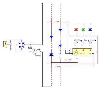 在此電路中,芯片供電利用壓差,電勢一級(jí)級(jí)的往下降,形成了梯式壓降,故而稱壓階傳輸。其實(shí),信號(hào)傳輸也利用了壓階傳輸?shù)姆绞剑酒c芯片之間的信號(hào)線串接了壓階管,這樣做的目的是經(jīng)過每一級(jí)后,降低一階信號(hào)電勢,使該級(jí)芯片的信號(hào)與地之間的電勢差保持正常工作的一個(gè)差值,否則,會(huì)因?yàn)橄鄬?duì)電勢過大而燒毀芯片。我們可以注意到這個(gè)電路只要兩條線,一條供電,一條信號(hào)傳輸,供電的線是串行的,所以總線上的電流比較小,用較細(xì)的線就行了。電路的末端,用了一個(gè)CYT1A50,它可以使整個(gè)線路恒流。另一方面,由于它的端口耐壓也比較高,可以將電路上多余的壓降壓在這顆芯片上。