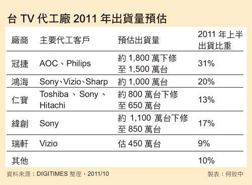 液晶電視制造龍頭冠捷雖握有自有品牌AOC與飛利浦(Philips)品牌訂單,但亦因整體市場需求不佳,下調(diào)2011年出貨量,從原先1,800萬臺(tái)下修至約1,500萬臺(tái);緯創(chuàng)第3季表現(xiàn)雖相對較佳,出貨量仍逐月成長,一路從55萬臺(tái)爬升至80萬臺(tái),然近期亦將全年液晶電視出貨量從1,100萬臺(tái)下修至約850萬臺(tái);至于手握Sony液晶電視訂單的鴻海,2011年也面臨出貨量下修窘境。