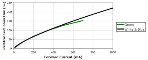 由圖中可以看到,如果正向電流從350mA降低8.75倍到40mA,其相對發(fā)光強(qiáng)度將從100降低到20。降低將近5倍。顯然這是完全不能允許的。所以一定要把電流恒定。