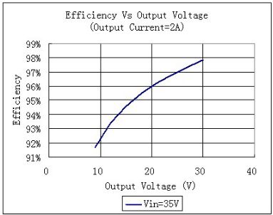 降壓型恒流源的缺點(diǎn)是要求輸入電壓高于輸出電壓,而太陽能LED路燈中所采用的蓄電池往往是12V,頂多是24V。而路燈中的LED通常是10個串聯(lián),其所要求的總輸出電壓往往在33V-36V左右,因此較難采用降壓型的恒流源。而降壓型恒流源的優(yōu)點(diǎn)是效率高。因?yàn)檩斎腚妷焊哂谳敵鲭妷海暂斎腚娏餍∮谳敵鲭娏鳌k娏餍∮兄跍p小電阻性損耗。圖15表明一個降壓型恒流源在輸入電壓固定在35V,輸出電流固定在2A時,其效率和輸出電壓的關(guān)系曲線。